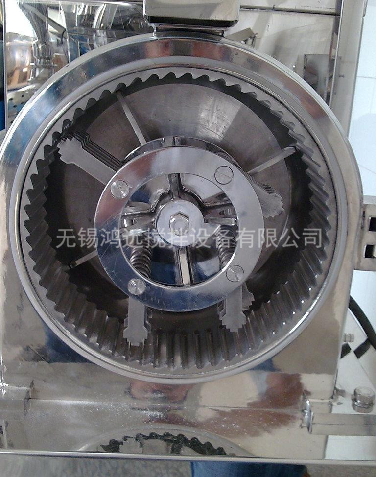該機(jī)由加料斗,分級輪,粉碎刀片,齒圈,粉碎電機(jī),出料口,風(fēng)葉,集料箱,吸塵箱等部分組成,物料由加料斗進(jìn)入粉碎室,通過高速旋轉(zhuǎn)的刀片進(jìn)行粉碎,調(diào)節(jié)分級輪與分級盤的距離來達(dá)到所要求的物料細(xì)度,高速旋轉(zhuǎn)的風(fēng)葉把達(dá)到要求的物料從粉碎室引到集料箱布袋中,沒有達(dá)到要求的物料繼續(xù)在粉碎室中粉碎,集料箱布袋產(chǎn)生的粉塵由吸塵箱收集,該機(jī)組按“GMP”標(biāo)準(zhǔn)設(shè)計(jì),結(jié)構(gòu)簡單,操作清理方便,噪音小,產(chǎn)量高,機(jī)器采用不銹鋼材料制作,粉碎過程中無粉塵飛揚(yáng)。